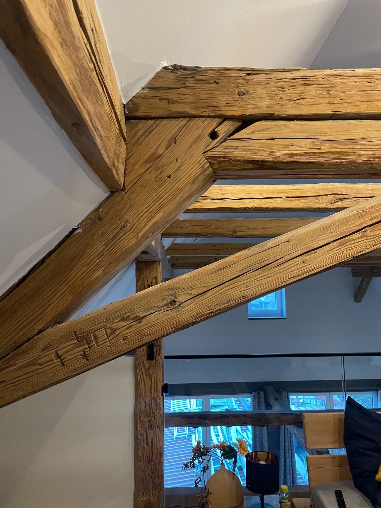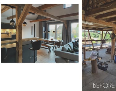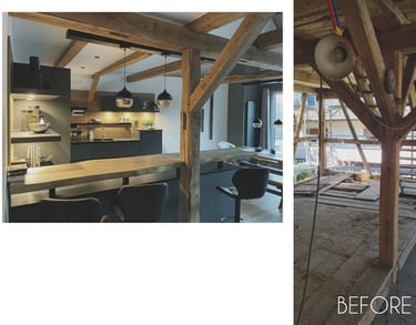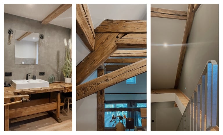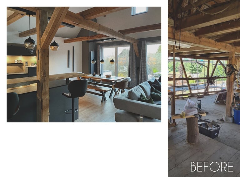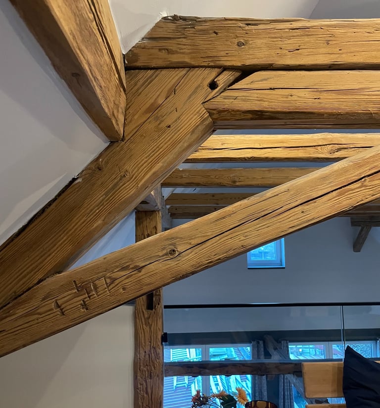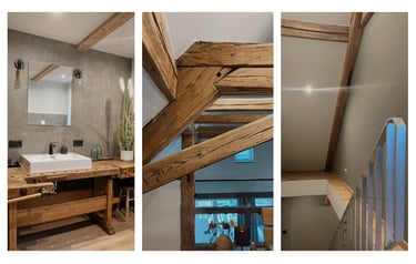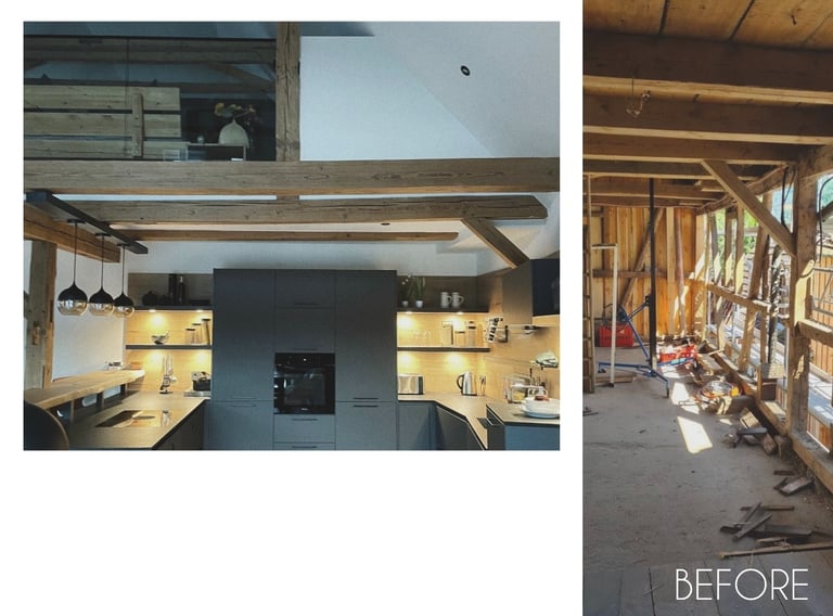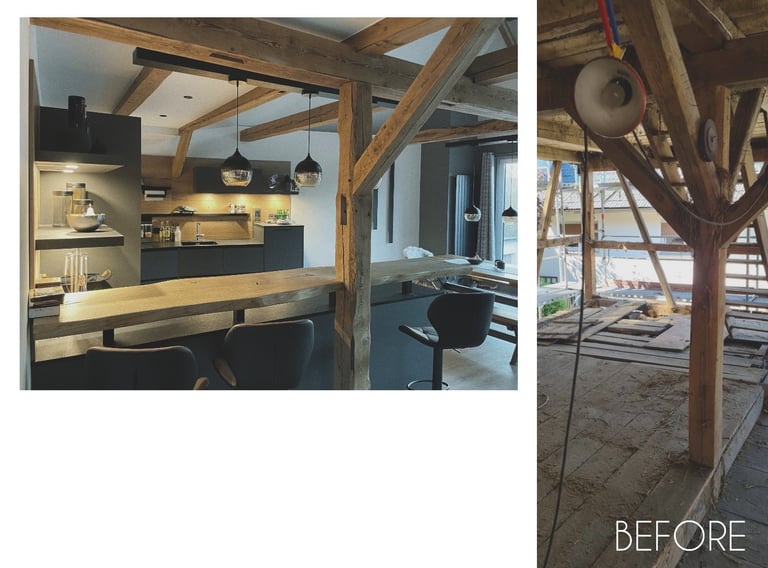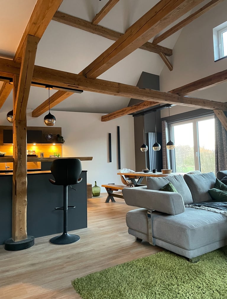 Entdecken Sie unsere Umwandlung eines alten Scheunen in ein geräumiges Apartment im fränkischen Dorf. Die natürliche Schönheit der Holzstruktur (Säulen und Balken) bleibt erhalten, während der offene Grundriss eine warme und wertvolle Atmosphäre schafft. Ein gelungener Mix aus Geschichte und zeitgemäßem Wohnkomfort.